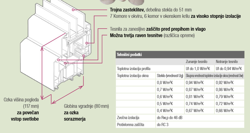 Trojno zastekljeno okna ALUKOMEN z vgrajenimi profili Rehau Synego so visoko energetsko učinkovita rešitev z izjemno stopnjo toplotne izolativnosti okna, Uw vrednost = 0,66 W/m²K. V primerjavi z aktualnimi standardnimi okni omogočajo do 50% več toplotne izolacije.